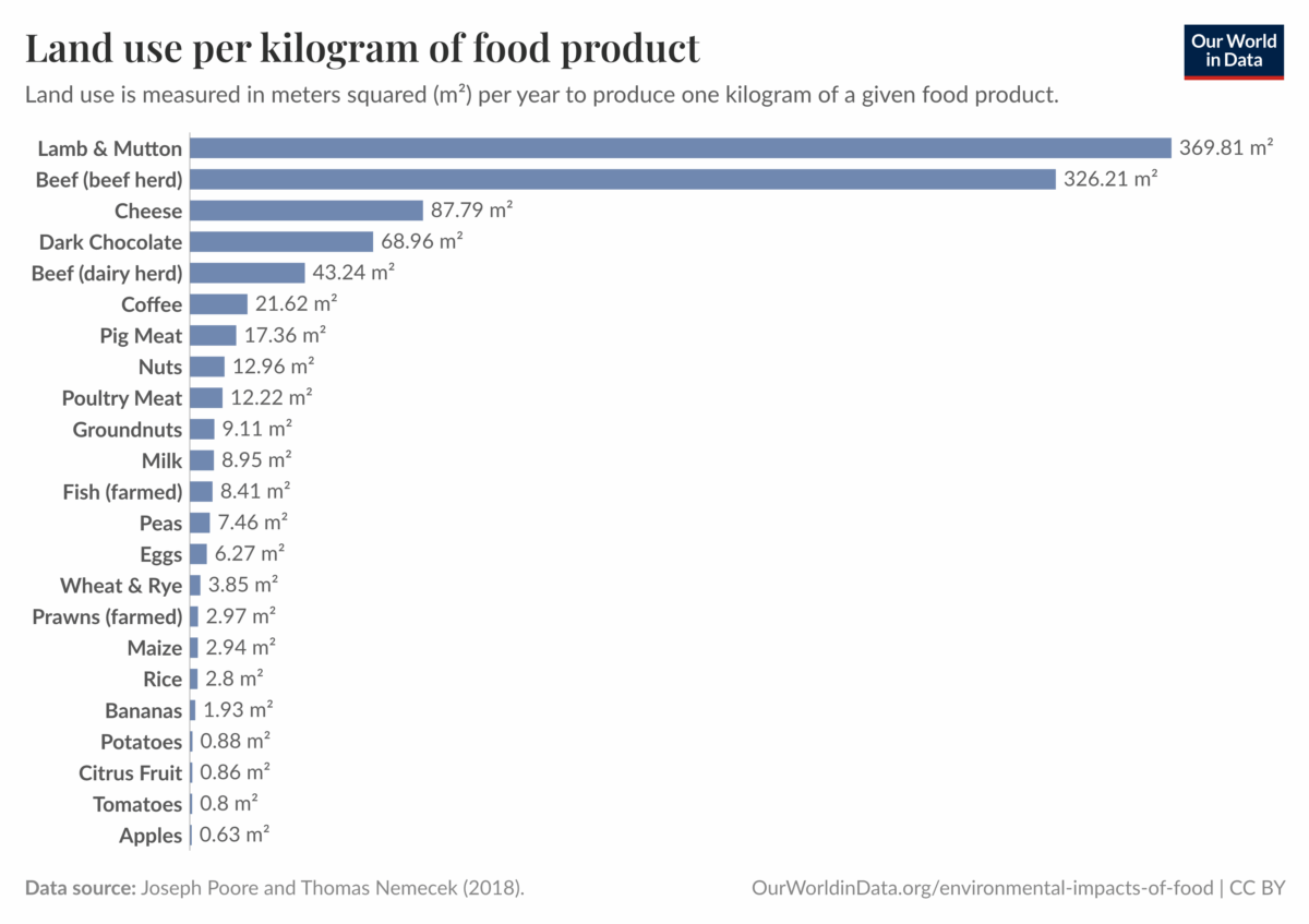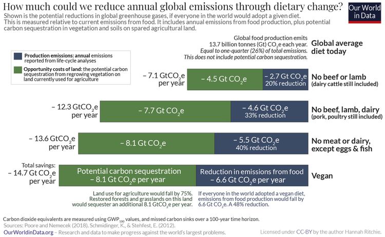 L’article de Lloyd me rappelle les données (de Our World in Data) connues mais oubliées trop facilement, qu’il vaut de répéter : l’alimentation carnée produit des émissions de GES ET mobilise de l’espace qui autrement pourrait servir à la séquestration de carbone en laissant les forêts reprendre leur place.