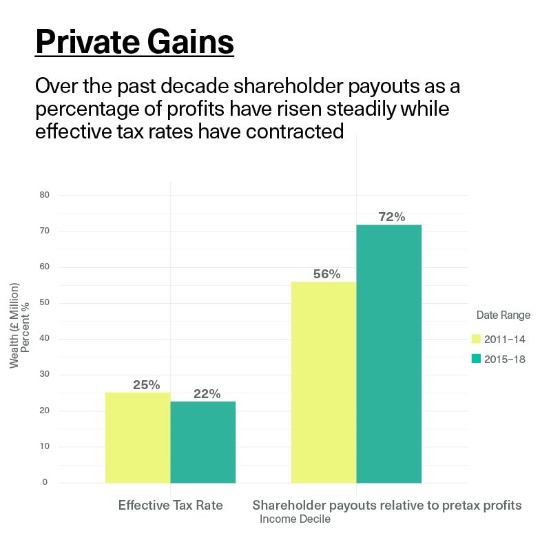 Les bénéfices des entreprises ont à leur tour été redirigés vers les actionnaires sous forme d’augmentation des dividendes et de rachats d’actions, plutôt que réinvestis dans la capacité productive de l’entreprise ou dans l’augmentation des salaires réels, les liquidités des entreprises passant d’une utilisation productive à une utilisation financiarisée. Entre 2011 et 2018, les 100 plus grandes entreprises non financières domiciliées au Royaume-Uni ont versé plus de 400 milliards de livres sterling en dividendes, soit l’équivalent de 68 % de leurs bénéfices nets sur cette période, et 61 milliards de livres sterling supplémentaires en rachats d’actions.[2] Rien qu’en 2019, les dividendes versés par les entreprises cotées au FTSE 100, un groupe légèrement différent comprenant des entreprises financières et des sociétés non domiciliées, ont atteint le chiffre record de 110,5 milliards de livres sterling, soit une augmentation de 10,7 % par rapport à 2018 et plus du double des 54 milliards versés en 2009.[3] Et la rémunération des dirigeants est devenue totalement disproportionnée par rapport aux performances. D’après les derniers rapports, un peu plus de 700 dirigeants de 86 des 100 plus grandes entreprises non financières du Royaume-Uni détenaient collectivement 6 milliards de livres sterling en actions de leurs sociétés respectives, soit près de 8,5 millions de livres sterling par directeur.