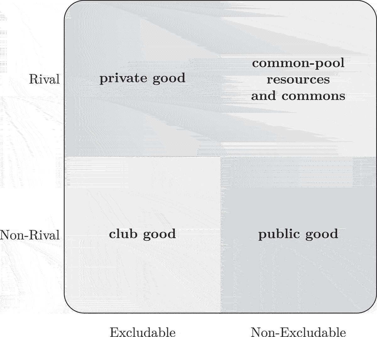 En raison de leur nature non excluable, les biens publics, les biens publics mondiaux, les ressources communes et les biens communs ont occupé une place particulièrement centrale dans les discussions sur les politiques publiques et la gouvernance de l’État (par exemple, Hazelkorn et Gibson, 2018 ; Heikkila, 2004 ; Holcombe, 2000). La section suivante traite des biens non exclusifs afin de préparer le terrain pour une analyse plus nuancée de la manière dont le bien commun s’écarte de cette classification. fournit une vue d’ensemble.