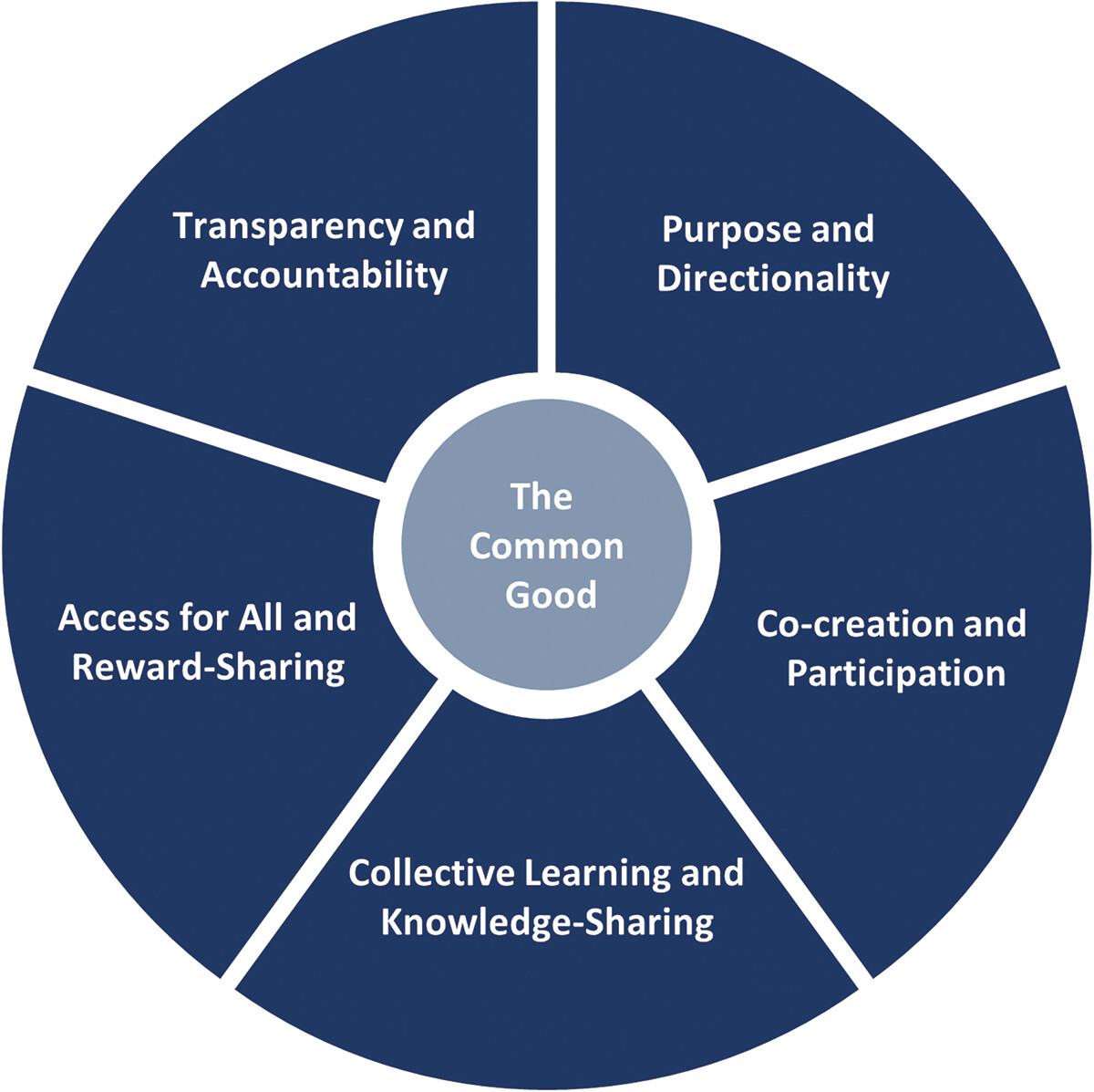 L’article propose donc un schéma du bien commun en tant qu’objectif, centré sur le « quoi » et le « comment » comme questions centrales qui guident l’activité économique collective. Une conception renouvelée du bien commun, ancrée dans la formation du marché et la valeur publique, peut être un moyen productif de créer des synergies entre les contributions précédentes tout en dépassant les lacunes existantes et en informant ce qui est considéré comme un moment urgent pour l’action collective. Il tire des enseignements précieux de la philosophie politique en soulignant la nature relationnelle et mutuelle du bien commun. L’article propose un schéma dans lequel la manière dont les acteurs travaillent ensemble pour atteindre des objectifs collectifs est guidée par cinq principes clés : (1) objectif et orientation ; (2) co-création et participation ; (3) apprentissage collectif et partage des connaissances ; (4) accès pour tous et partage des récompenses ; et (5) transparence et responsabilité.