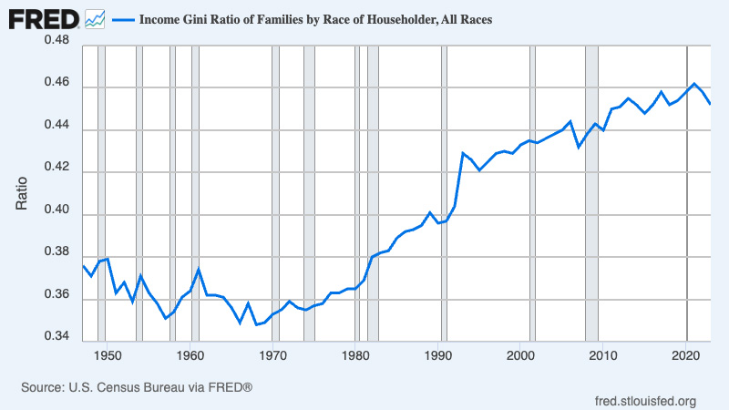 Il existe plusieurs façons de mesurer les inégalités. Je préfère les ratios simples comme ceux ci-dessus, mais d’autres économistes préfèrent des mesures plus complexes comme le coefficient de Gini. Je ne vais pas essayer d’expliquer comment fonctionne ce coefficient, mais voici à quoi il ressemble au fil du temps :