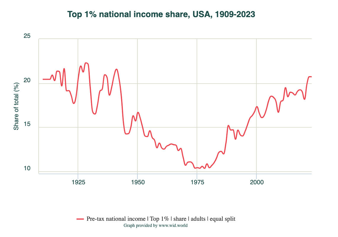 Une grande partie de ce que nous savons sur les inégalités modernes provient d’enquêtes qui n’ont commencé qu’à partir des années 1940. Nous disposons toutefois d’autres sources de données, notamment sur les personnes à revenus élevés qui ont commencé à payer des impôts sur le revenu aux États-Unis après 1913 et au Royaume-Uni bien avant. Ces données peuvent être utilisées pour estimer la part des revenus allant aux groupes les plus riches au cours du siècle dernier ou plus, comme le montre ce graphique de la Base de données sur les inégalités mondiales, qui estime la part du revenu total allant au 1 % le plus riche entre 1909 et 2023 :