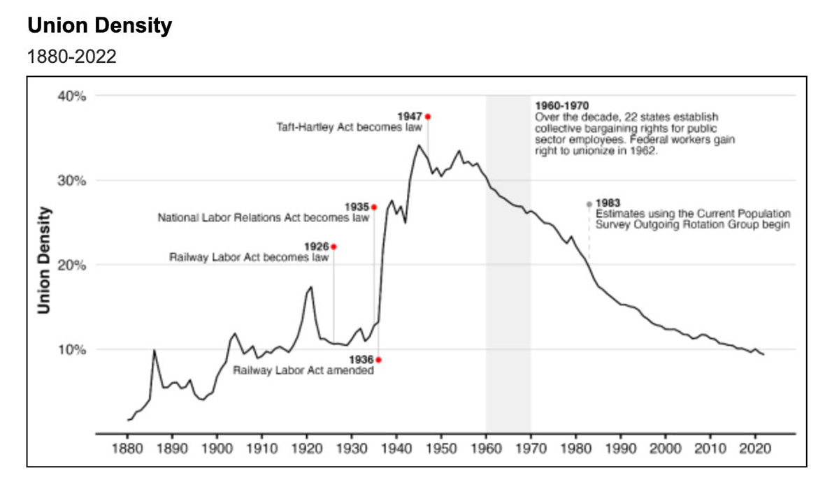 Voici un graphique qui donne un aperçu de certains des arguments que je présenterai la semaine prochaine. Il montre la densité syndicale, c’est-à-dire le pourcentage de travailleurs syndiqués, au fil du temps :