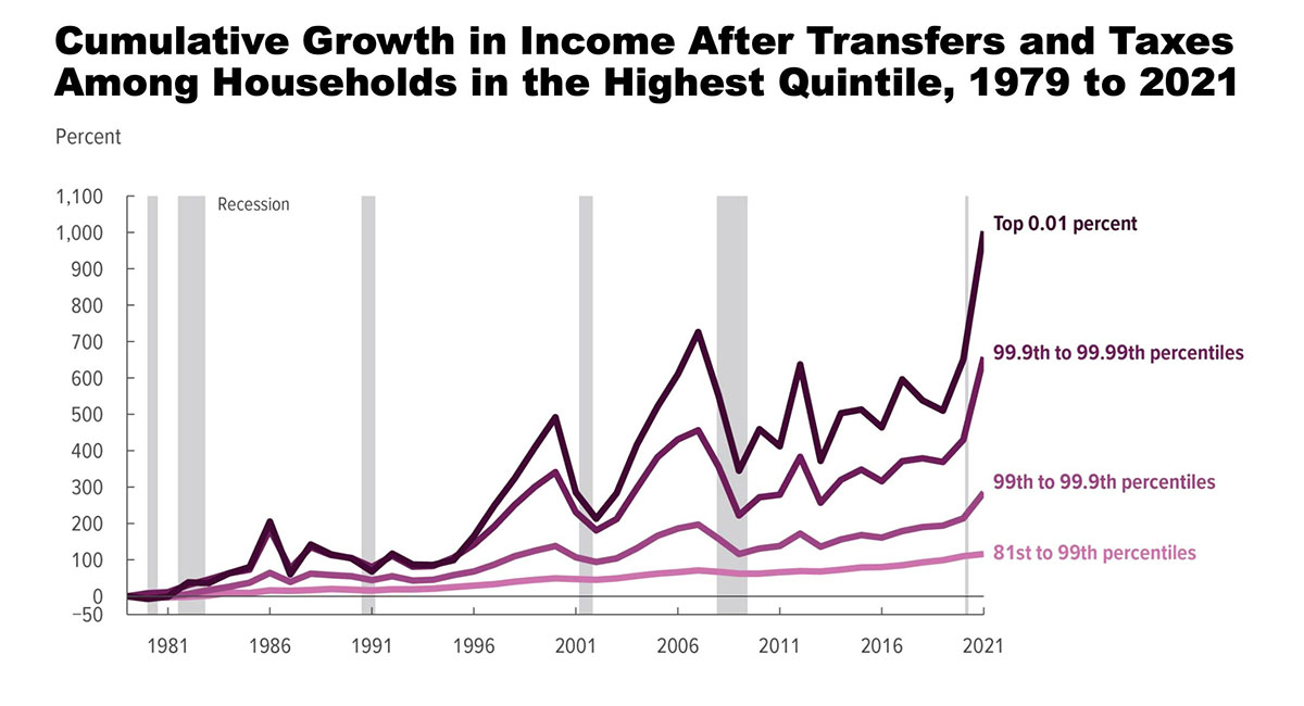 Il est important de noter qu’il ne s’agissait pas seulement d’un écart entre le quintile supérieur (les 20 % les plus riches de la population) et les 80 % restants. Nous avons également constaté une augmentation radicale des inégalités au sein des 20 % les plus riches. En d’autres termes, les riches s’éloignaient des simples nantis, et les ultra-riches s’éloignaient des simples riches. Voici un graphique saisissant du Congressional Budget Office :