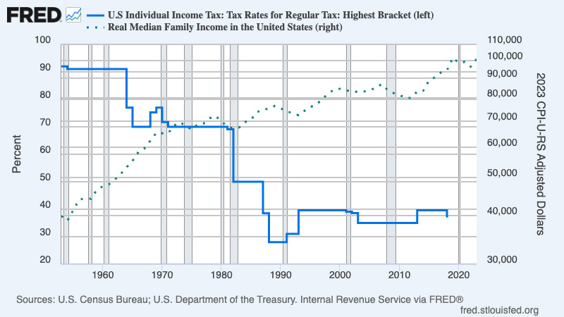 Un moyen simple de réfuter l’argument selon lequel nous devons maintenir les taux d’imposition les plus élevés à un niveau bas pour favoriser la croissance économique consiste à examiner l’histoire des États-Unis après la Seconde Guerre mondiale. Après la Seconde Guerre mondiale, les taux d’imposition les plus élevés étaient de 70 % ou plus pendant une génération. Cette période a coïncidé avec une amélioration considérable du niveau de vie, jamais égalée depuis :