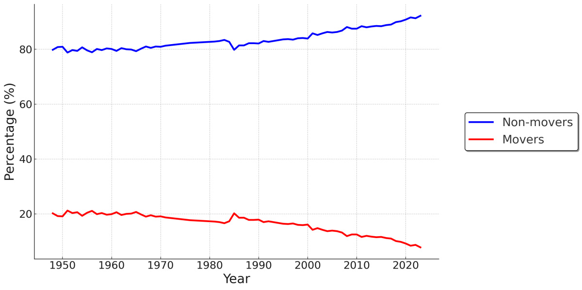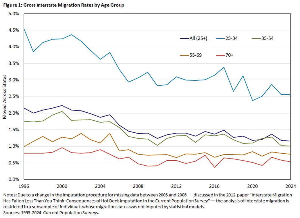 Je me trompais complètement à ce sujet. Les Américains sont de moins en moins enclins à déménager depuis le milieu des années 1980 :