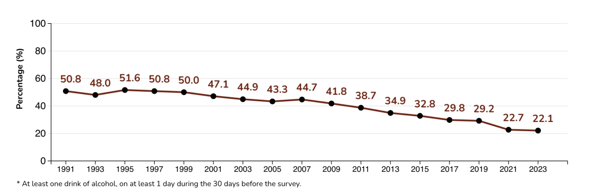 Commençons par les données claires, complètes et négligées : par rapport à leurs parents et grands-parents, les adolescents d’aujourd’hui sont une bande de petits saints. Par exemple, les lycéens sont moins de deux fois moins susceptibles de boire de l’alcool qu’ils ne l’étaient dans les années 1990 :