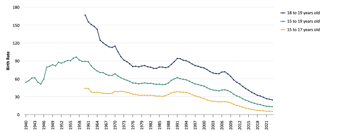 Toutes ces conclusions s’appuient sur des enquêtes, alors peut-être que de plus en plus d’enfants nous mentent chaque année ? Eh bien, il est assez difficile de mentir sur le fait d’avoir un bébé, et les grossesses chez les adolescentes ont également chuté depuis le début des années 1990 :