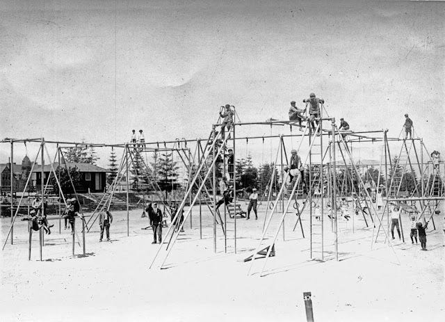Ma vie n’a rien à voir avec la leur. Personne ne m’a jamais demandé de tirer sur quelqu’un. J’ai une télévision grand écran. Je peux me faire livrer des sushis à domicile en 30 minutes. L’administration de la sécurité sociale pense que je pourrais atteindre l’âge de 80 ans. Pourquoi risquerais-je tout cela ? Les choses que mes grands-parents faisaient sans y penser – fumer, faire du stop à l’arrière d’une camionnette, reporter un traitement médical jusqu’à ce qu’il soit absolument nécessaire – me semblent aujourd’hui inconcevables.12Les stratégies de vie rapide sont encore possibles aujourd’hui, mais elles sont plus rares. Un jour, au lycée, j’étais chez un ami et sa mère a allumé une cigarette dans le salon. J’ai dû avoir l’air choqué, car elle m’a fait un haussement d’épaules et m’a dit : « Si les cigarettes ne me tuent pas, autre chose le fera. » Je pouvais au moins comprendre son point de vue : son mari était mort dans un accident de voiture avant même d’avoir atteint l’âge de 50 ans. Quand on a l’impression que son heure peut sonner à tout moment, pourquoi ne pas profiter de la vie ? J’ai une petite crise cardiaque rien qu’en regardant le genre de terrains de jeux qu’ils avaient à l’époque :