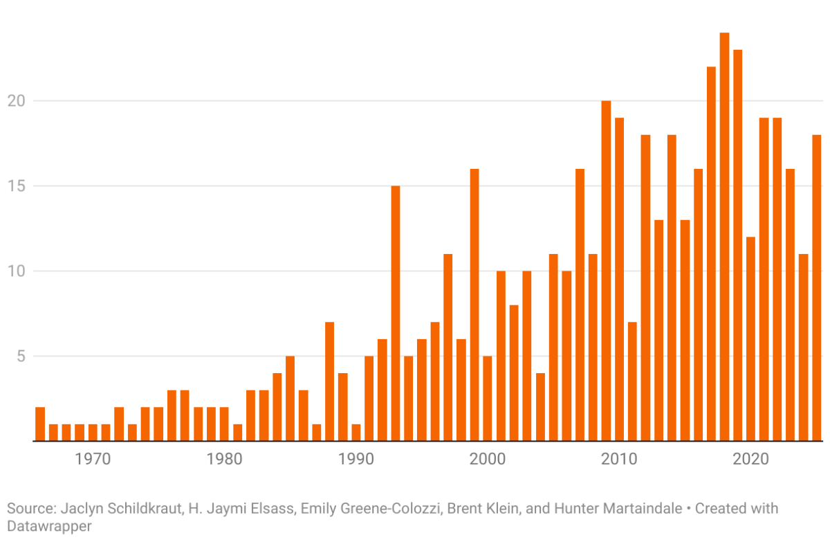 Tout d’abord, contrairement à d’autres formes de violence, les fusillades de masse sont devenues plus courantes depuis les années 90 (mais notez l’axe Y, nous parlons ici d’une partie extrêmement réduite de l’ensemble des crimes) :