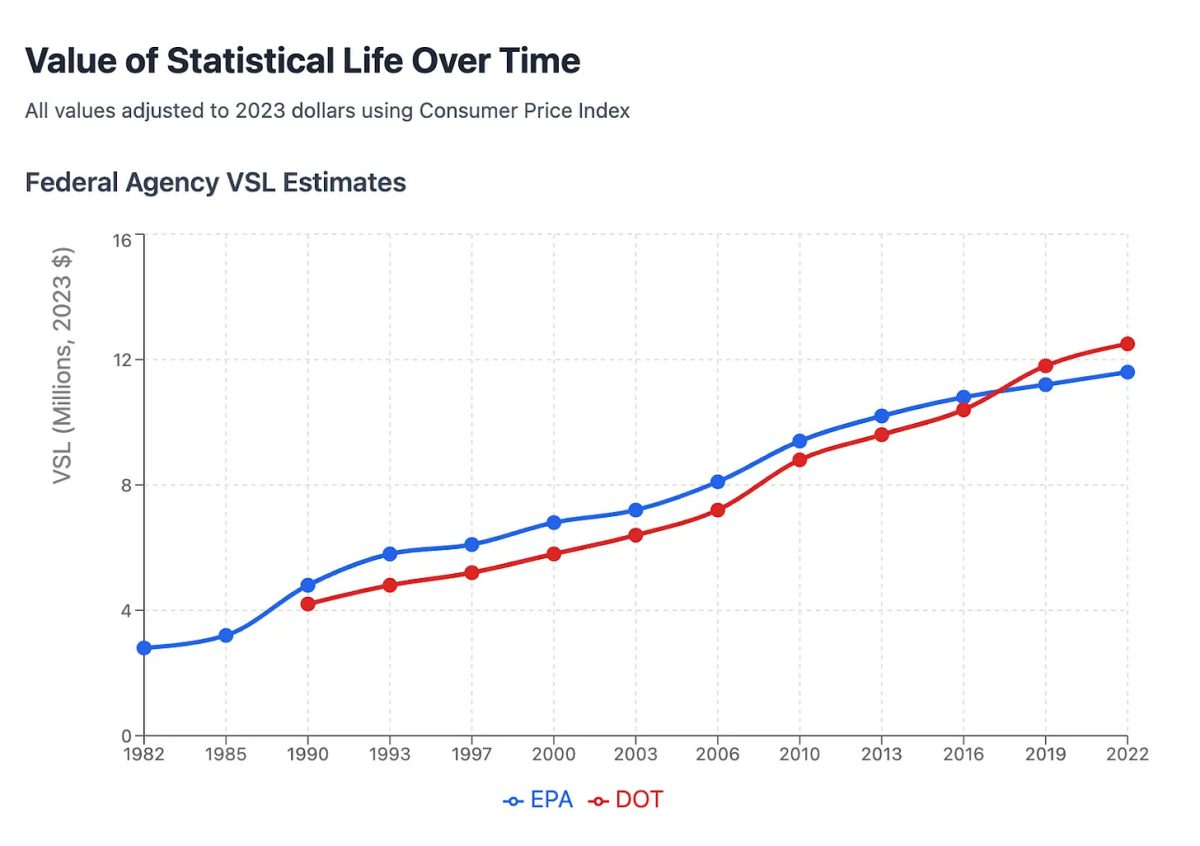 Lorsque les agences fédérales effectuent des analyses coûts-bénéfices, elles doivent déterminer la valeur d’une vie humaine. (Sinon, comment savoir s’il vaut la peine de construire, par exemple, une nouvelle autoroute qui aidera des millions de personnes à se rendre au travail à l’heure, mais qui pourrait causer des décès supplémentaires en raison de la pollution atmosphérique ?) Pour ce faire, elles demandent aux gens combien ils seraient prêts à payer pour réduire leur risque de mourir, puis elles utilisent cette information pour calculer la « valeur d’une vie statistique ». Selon une analyse de Substacker Linch, ces vies statistiques ont pris beaucoup plus de valeur au fil du temps :